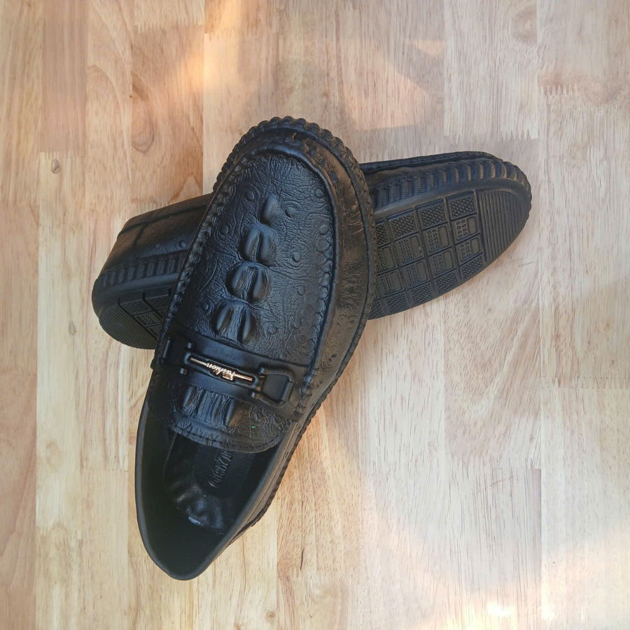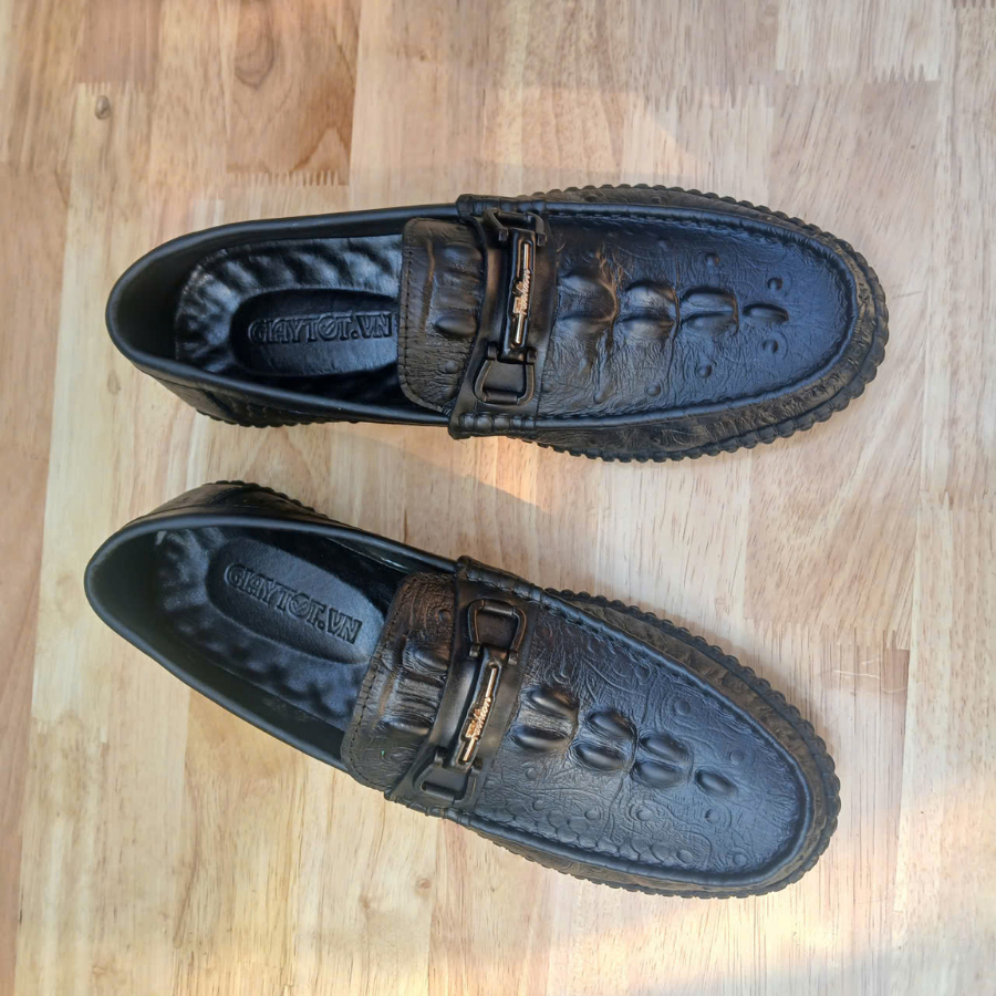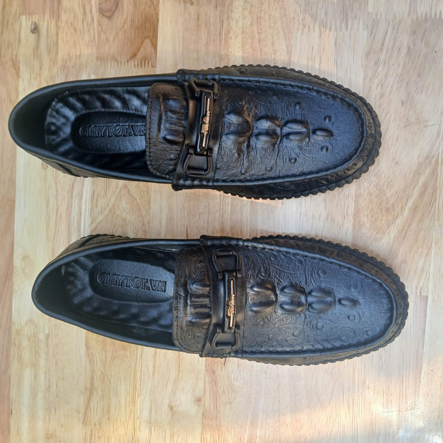 Giày lười da bò dập vân cá sấu là mẫu giày không dây được làm từ da bò thật nhưng có bề mặt được dập vân họa tiết giống da cá sấu, tạo vẻ sang trọng, đẳng cấp hơn so với da trơn thông thường — rất phù hợp cho cả đi làm, đi chơi, hoặc dự sự kiện smart-casual.